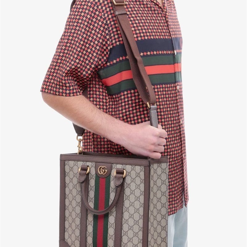GG Supreme Fabric and leather handbag with iconic Web Band – Closure with metal hook – Removable and adjustable fabric shoulder strap – Internal pockets – made in Italy – GG Supreme fabric / Leather – Width : 11,81in – Height : 12,60in – Depth : 4,13in 30 x 32 x 10.5cm