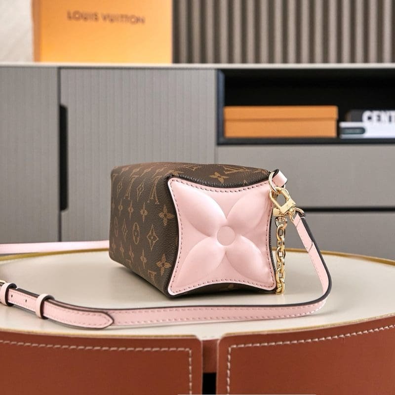 The Bloom pouch combines Louis Vuitton’s iconic Monogram canvas with pastel-colored leather on its side panels. This feminine mini bag is notable for its distinctive shape, inspired by a Monogram Flower. It can hold essentials such as a compact wallet, phone, keys and lipstick, and can be worn with or without its delicate, gold-tone chain….