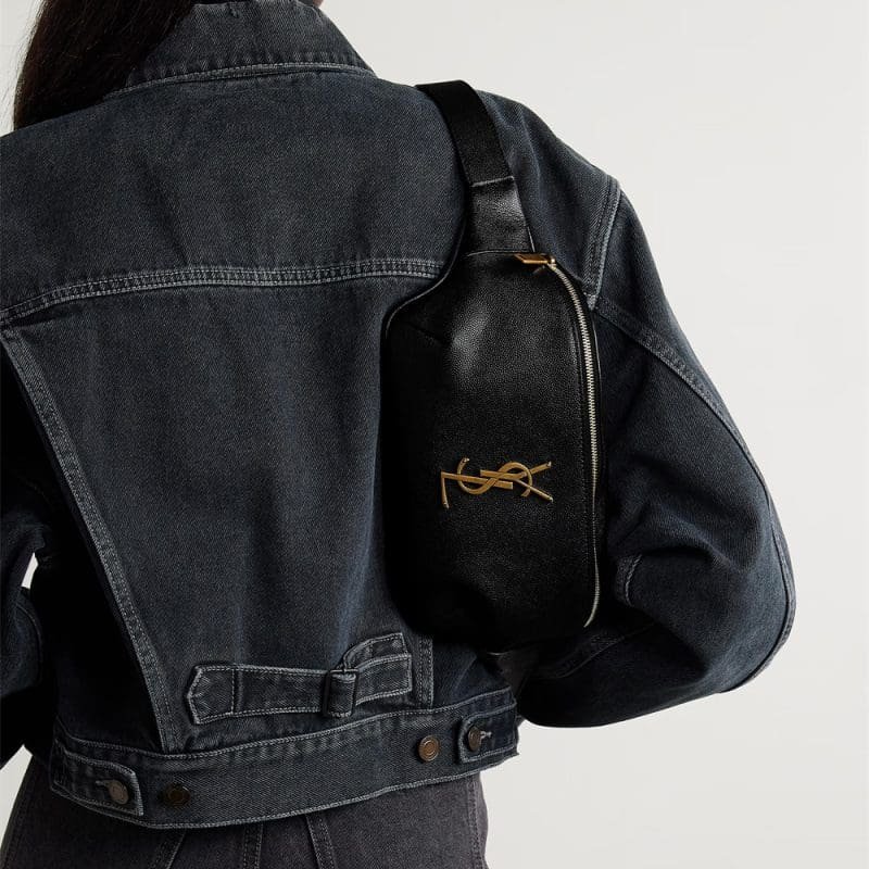 Saint Laurent “Kate” wallet in cotton, linen, and leather Features signature YSL logo lettering Chain shoulder strap, 13.5″L Can be worn as a wallet or shoulder bag Flap top with magnetic closure Interior, one slip pocket Bronze hardware Approx. 5.1″H x 7.8″W x 2.3″D/ 13 x 20 x 6cm