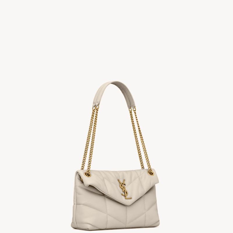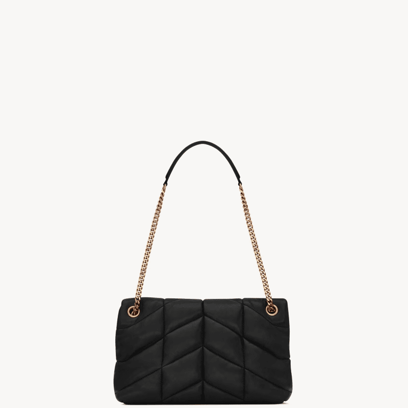THE ICONIC LOULOU IN PUFFER VERSION, WITH CHEVRON QUILT OVERSTITCHING. FEATURING A SLIDING CHAIN STRAP THAT CAN BE WORN ON THE SHOULDER OR CROSSBODY. cotton lining Light bronze metal hardware Magnetic snap tab ONE interior zipped pocket Dimensions: 11.4 x 6.6 x 4.3 inches/29 x 17 x 11 CM Chain length: 11 to 20 inches