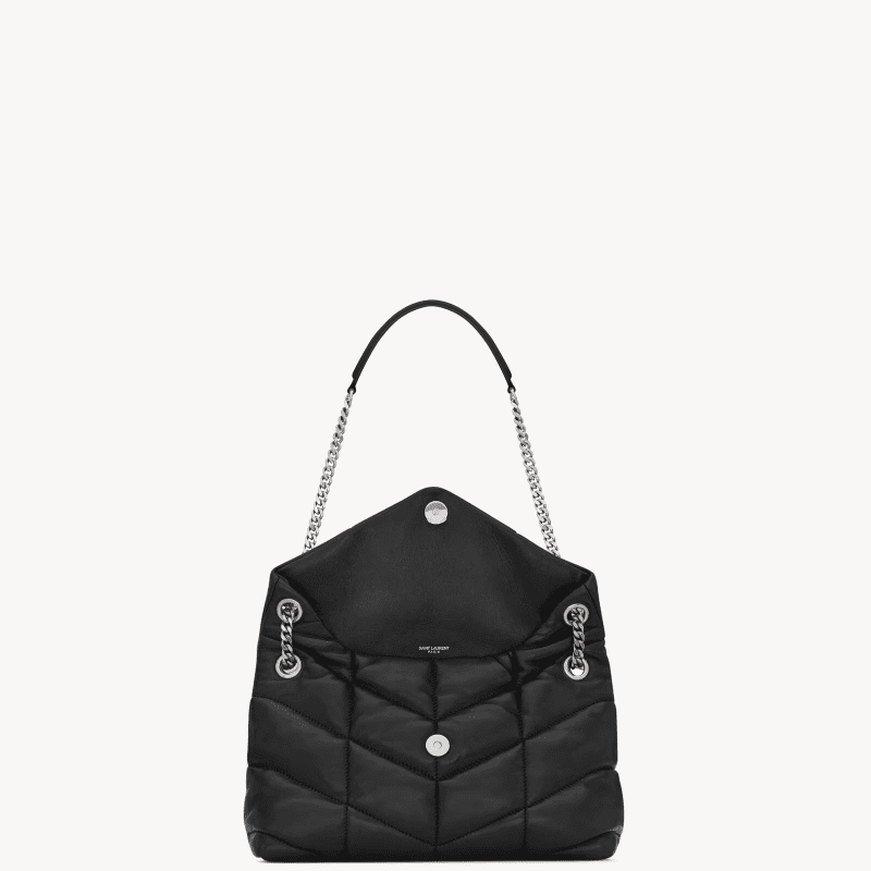 THE ICONIC LOULOU IN PUFFER VERSION, WITH CHEVRON QUILT OVERSTITCHING. FEATURING A SLIDING CHAIN STRAP THAT CAN BE WORN ON THE SHOULDER OR CROSSBODY. Grosgrain lining Light bronze metal hardware Magnetic snap tab ONE interior zipped pocket Dimensions: 11.4 x 6.6 x 4.3 inches/29 x 17 x 11 cm Chain length: 11 to 20 inches