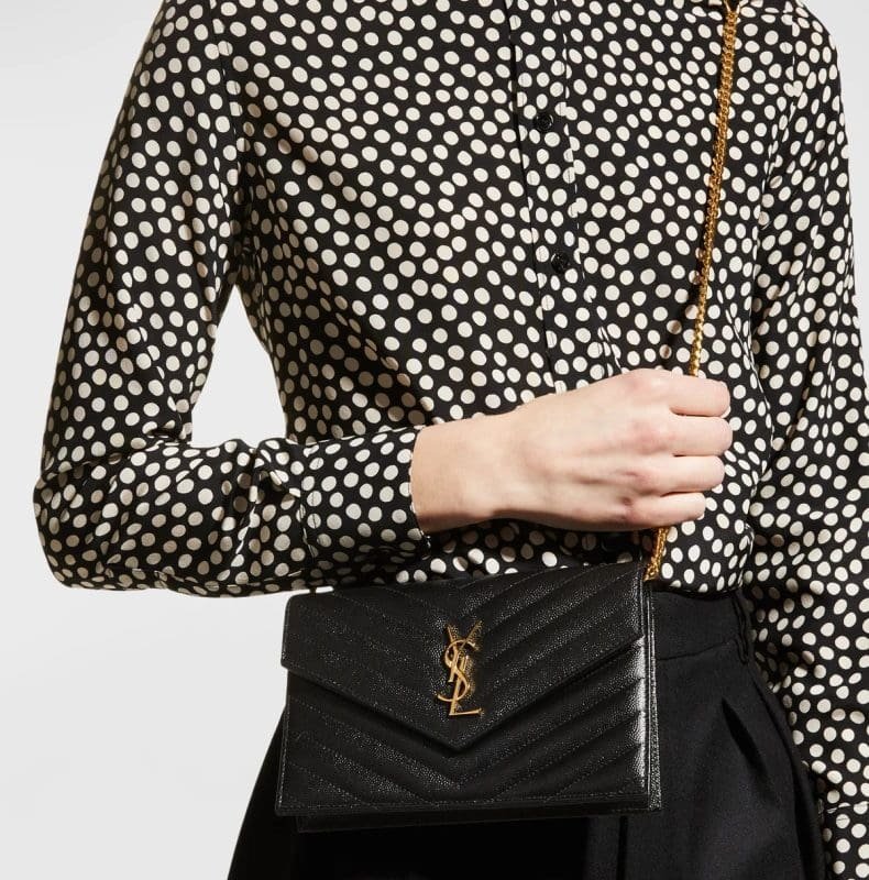 Saint Laurent crossbody bag in quilted grain de poudre calf leather Features YSL logo lettering on front; gold-tone hardware Detachable, adjustable chain shoulder strap; approx. 18.89″L Can be worn on the shoulder or a cross body Envelope flap top with snap closure Golden hardware Interior, one zip pocket and six card slots Approx. 4.9″H x 7.5″W…